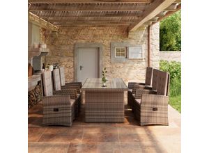 Verwandeln Sie die Terrasse in einen einladenden Outdoor-Essbereich mit dieser Gartentischgruppe (7-teilig) in Graubraun. Im Mittelpunkt steht der ca. 200…