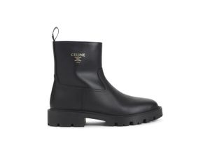 Die Celine Stiefeletten sind aus hochwertigem schwarzem Kalbsleder gefertigt und präsentieren eine runde Zehenform sowie eine robuste Profilsohle. Ein 3,5…