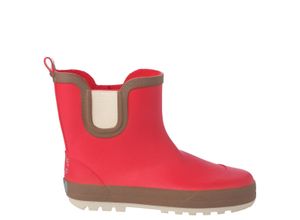 Rote Gummistiefel mit Farbakzenten in Braun. Kurzer Schaft mit elastischen Einsätzen seitlich und kleiner Schlaufe hinten für einfaches An- und Ausziehen.…