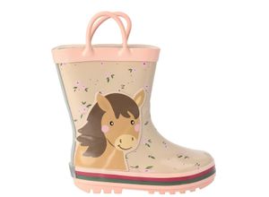Beige Gummistiefel mit kleinen Blumen als Allover-Muster und Pferde-Applikation an der Außenseite. Praktisch mit zwei Henkeln am hohen Schaft. Profilierte…