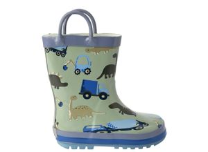 Hellgrüne Gummistiefel mit verschiedenen Dinos und Fahrzeug-Motiven als Allover-Muster. Praktisch mit zwei Henkeln am hohen Schaft. Profilierte…