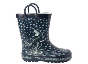 Dunkelblaue Gummistiefel mit Allover-Muster und Dinosaurier-Applikation an der Außenseite. Praktisch mit zwei Henkeln am hohen Schaft. Profilierte…