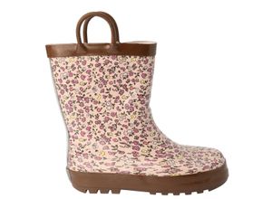Beige Gummistiefel mit kleinen Blumen als Allover-Muster. Praktisch mit zwei Henkeln am hohen Schaft. Profilierte Gummilaufsohle in Braun. Reflektierende…