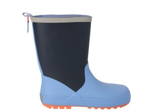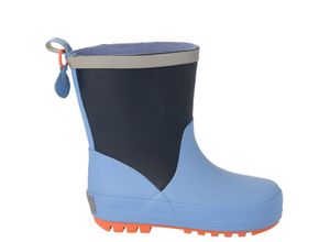 Wetterfeste Regenstiefel in Dunkel- und Hellblau mit reflektierenden Details. Lasche am hohen Schaft zum einfachen Anziehen, mit kleinem Anhänger.…