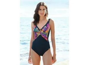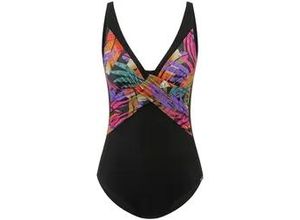 Badeanzug von Charmline ohne Bügel. Rundum klassisch unifarben mit einer feinen Dosis Eleganz durch den einzigartigen Print mit Palmblättern vorne auf…