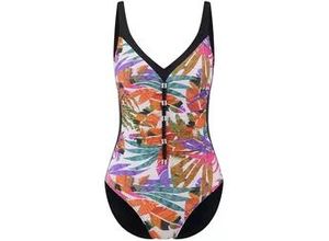 Badeanzug von Charmline ohne Bügel. Rundum klassisch unifarben mit einer feinen Dosis Eleganz durch den einzigartigen Print mit Palmblättern vorne auf…